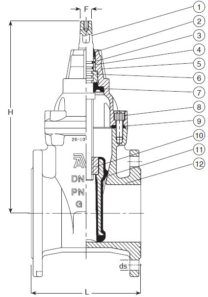 - Клин - ковкий чугун ; сердечник полностью вулканизирован EPDM; интегральная гайка клина из устойчивой к обесцинкиванию латуни CW602N по EN12167 (CZ 132 по BS 2874)