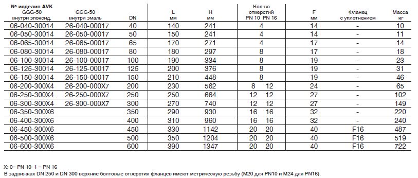 Габаритные и присоединительные размеры магистральной задвижки AVK типа 06/30